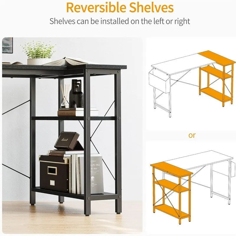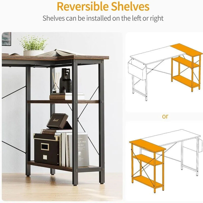 - The L shaped desk with storage shelves provide spacious space allow you to store unlimited office supllices, and the storage bag releases you from trouble of messy small stuffs. Keep your desktop tidy.