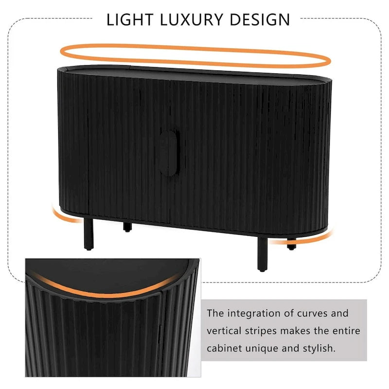 The combination of curves and straight lines makes this cabinet more distinctive, and the wavy cabinet surface is very textured.The entire cabinet frame as well as the table top are made of MDF.The four legs are made of pine.The entire desktop can bear 220lbs.Each shelf in the cabinet can also bear the weight of 50lbs. In addition to being able to place a lot of things on the top of the cabinet, there is also quite a lot of space inside the cabinet, and the internal shelves can be adjusted freely. Our cabinet shipped with easy-to-follow and detailed instructions, all of the hardware and pieces were labeled perfectly and easy to assemble.