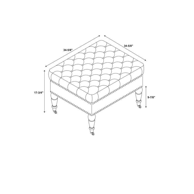 The Abigal Tan Velvet Square Tufted Ottoman is a stylish and versatile addition to your home's dcor. Perfect for use as an ottoman or coffee table, the piece has a tufted top upholstered in a soft tan fabric. Antique brass nailheads accent the side, while turned dark walnut finished legs complete the piece.