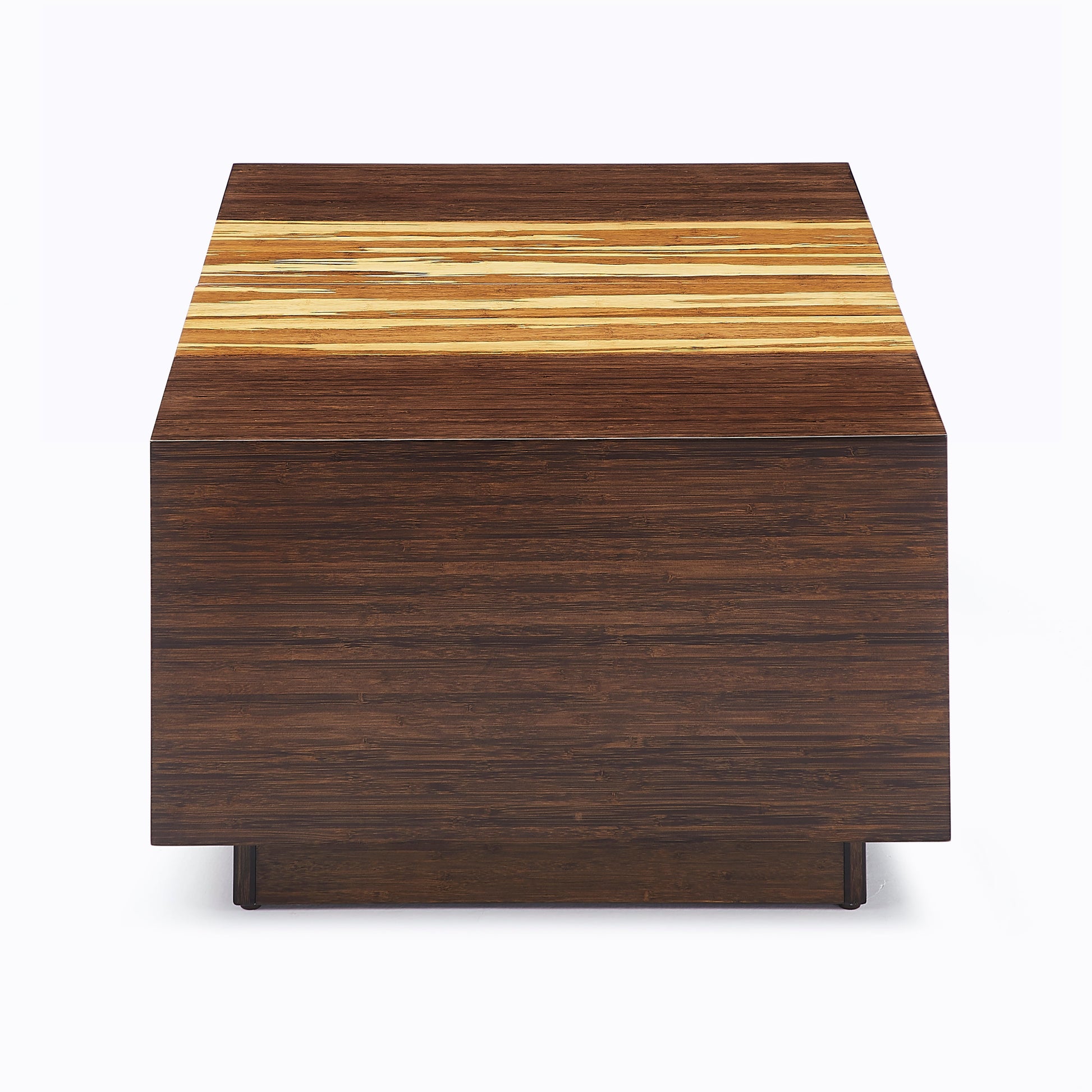 Taking its rightful place as the center piece of your seating area, the Azara Cube is crafted in sustainable solid bamboo in rich Sable finish with a stunning center accent in Exotic tiger. Minimal and modern, the spectacular grain patterns of solid Exotic Tiger bamboo complement the simple cube design. When pulled apart, the table silently glides sideways to reveal discreet storage!