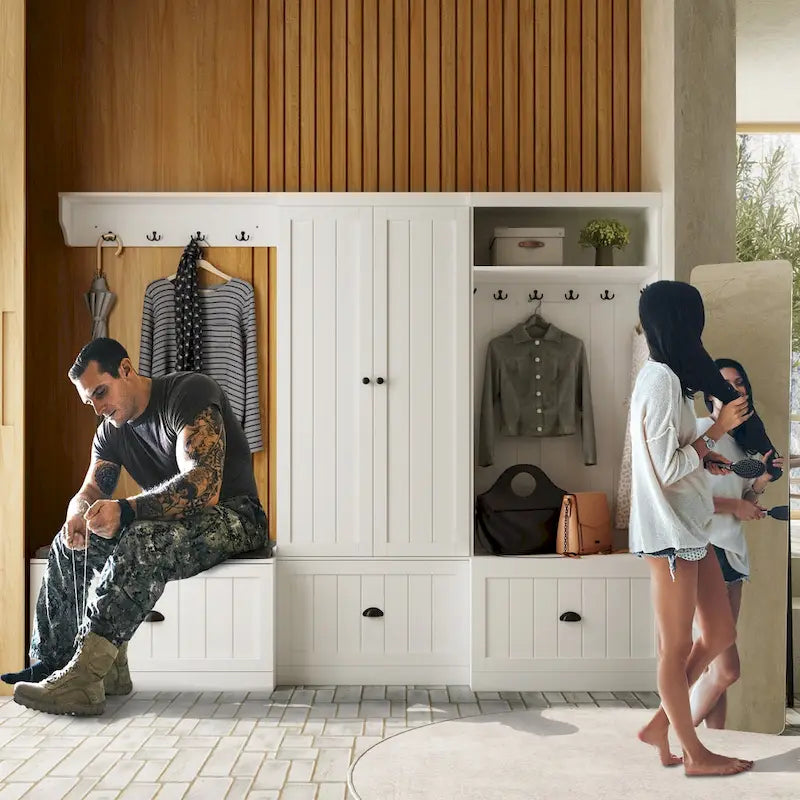 - Hall trees with additional hanging storage, spacious drawers, and entryway bench with cushioned seat