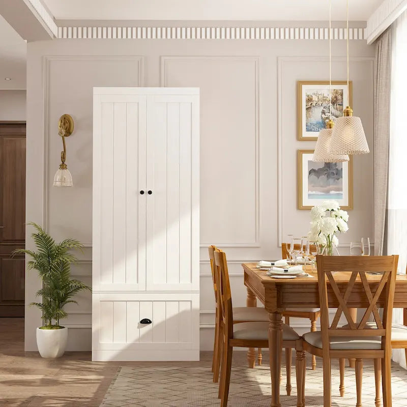 Maximize the storage potential of your entryway with this versatile hall tree and closet organizer combo set. The modular design allows for flexibility and customizable storage options. The pantry closets feature adjustable shelves and full-extension drawers, while the hall trees offer additional hanging storage, a spacious drawer, and an entryway bench with a comfortable cushioned seat. Each drawer is equipped with label holder hardware for easy organization. The set pairs well with traditional, farmhouse, and transitional dcor.