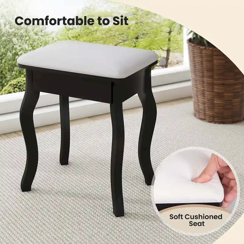 The curved legs keep the table and stool sturdy. Equipped with non-slip foot pads and anti-toppling device, this makeup vanity set stays steady on the ground. The vanity table set is equipped with a tri-folding mirror for HD reflection from different angles. You can fold 2 side mirrors if needed. Additionally, 10 LED lights help you better enjoy your beauty. The light brightness can be adjusted by long pressing the touch button. Furthermore, the vanity desk is designed with 1 open shelf, 1 compartment, 1 wide desktop, 2 small drawers, and 2 large drawers to keep your items well organized. The cushioned stool allows for ultimate comfort.