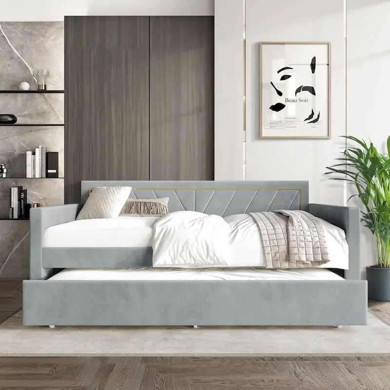 Enhance your living space with the sophisticated charm of our elegant daybed. The classic stitching style on the back panel adds a luxurious touch, elevating the daybed's appeal. The gold PU back panel exudes opulence, creating a warm and inviting ambiance in any room. Crafted with the finest materials and attention to detail, this velvet-upholstered daybed exudes both durability and elegance. The velvety texture adds a touch of opulence and sophistication, elevating the daybed's overall allure. Designed for multi-functional use, this daybed serves as both extra seating and a cozy sleeping space. This daybed comes with trundles provide highly versatile and can be used in various settings. Crafted with a solid rubberwood and MDF wood frame for stability, no box spring is required as the daybed comes with slat kits. Available in twin size with twin size trundle, and showcasing exquisite hues of champagne, navy blue, silver grey, and black, this daybed seamlessly blends style and versatility. Simple to assemble and conveniently shipped in two boxes. Experience the perfect balance of comfort and elegance with our exquisite daybed.