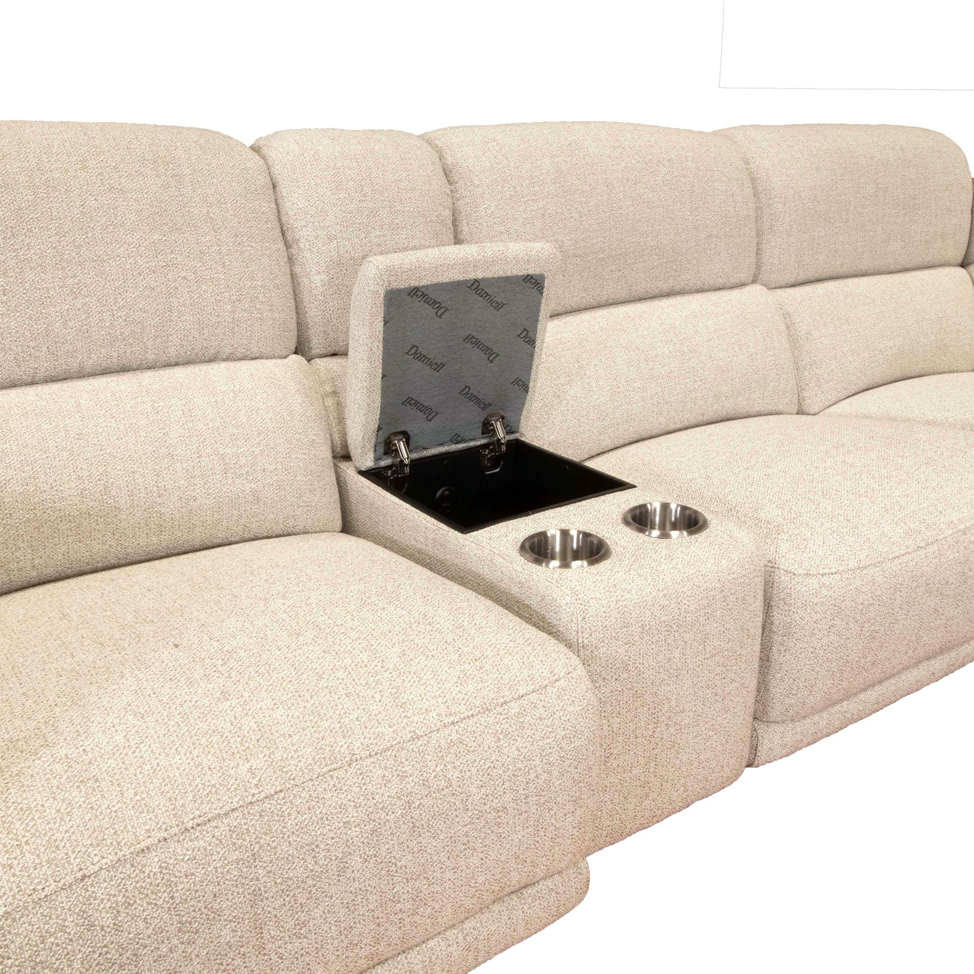 The Dallas Sectional is a stylish, modern addition to any living space. With cushioned armrests and cozy cream fabric, this sectional offers comfort and style. The power reclining feature allows for the perfect lounging experience, while the storage console adds practicality. Perfect for a cozy night in (with snacks)!