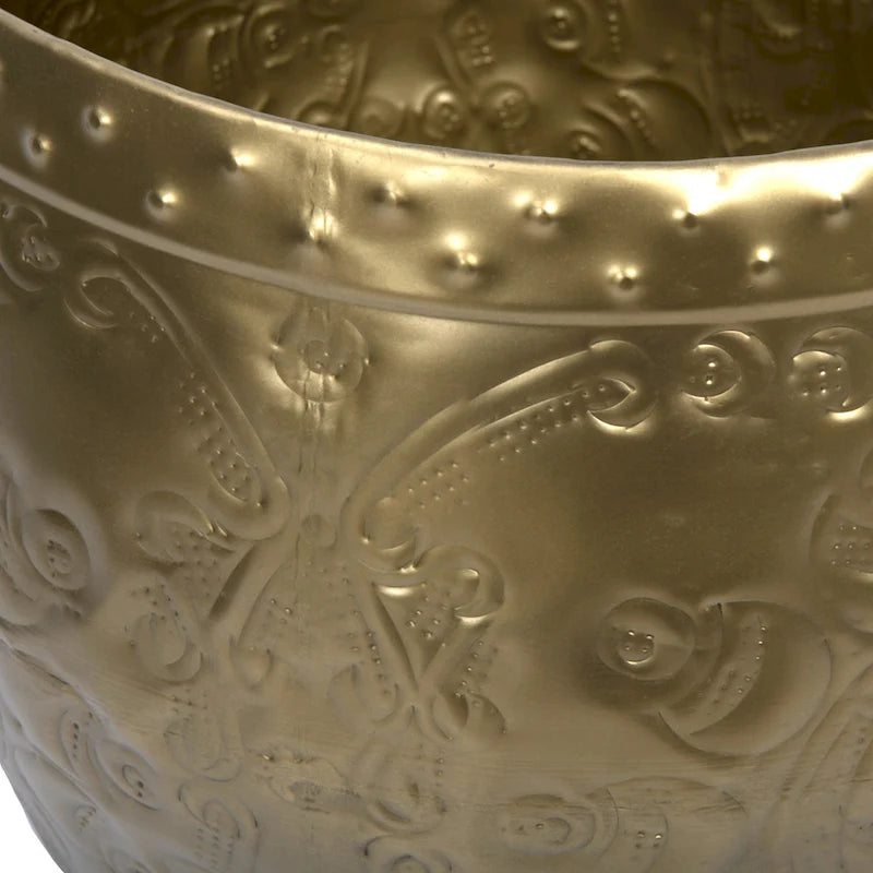 - Elevate the living space with this stunning Brass Debossed Metal Drum Side Table, boasting a brass finish and intricate debossed details for a touch of elegance
