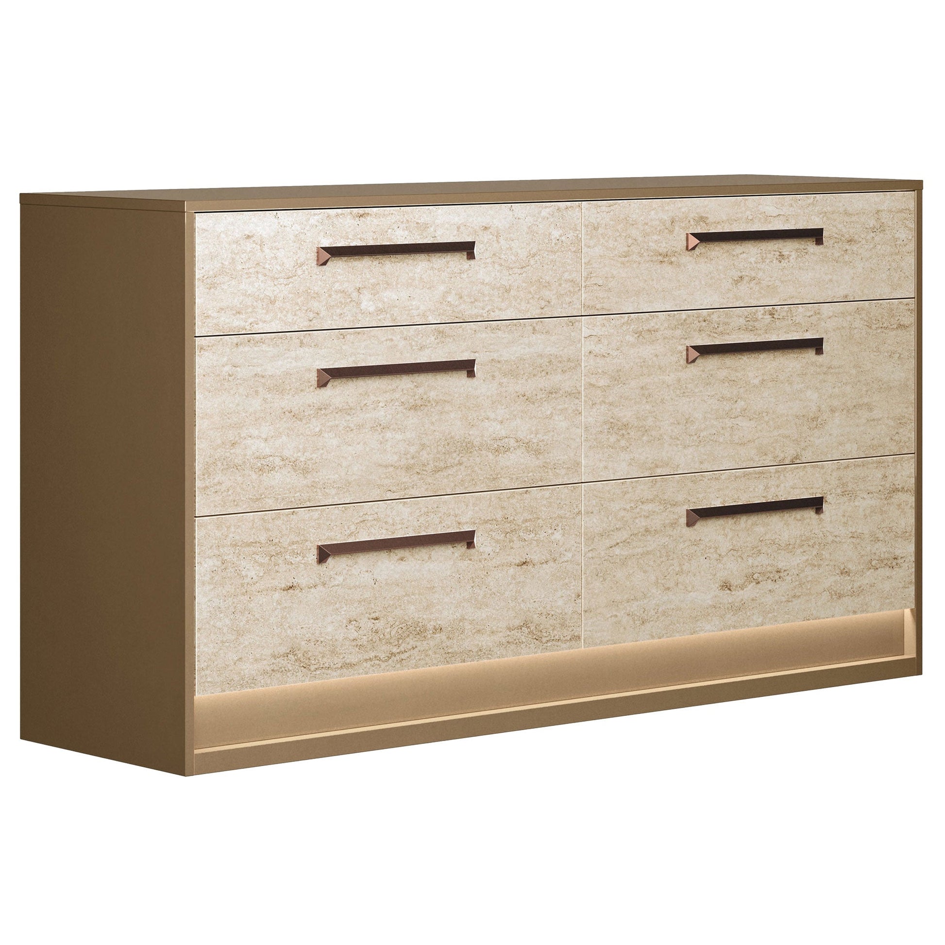 In the Jo Bedroom Collection, the tactile richness of travertine stone is complemented by the essence of gold. A display of opulent tones converges in an elegant design, where each surface seamlessly alternates with lit edges. Both the headboard and nightstand light up with the touch of a button.