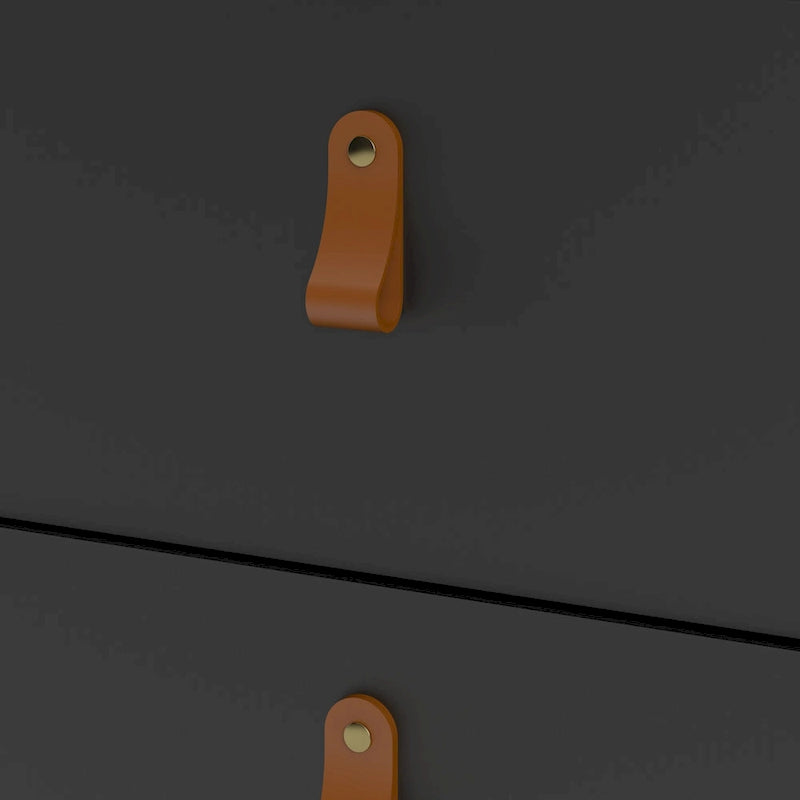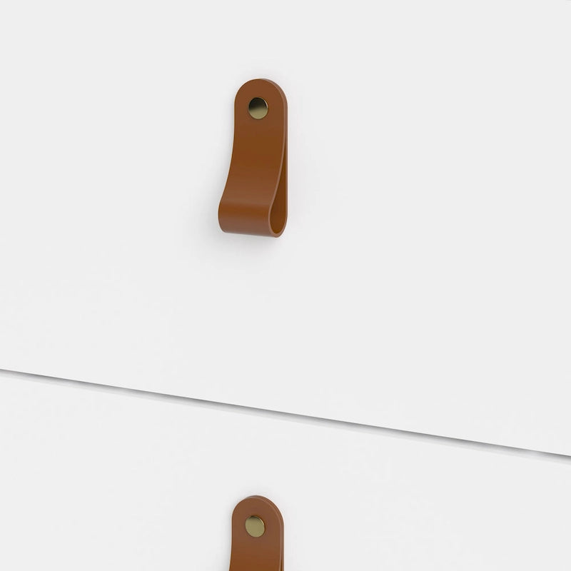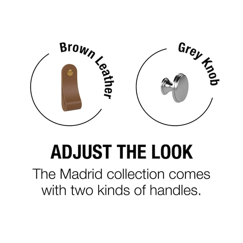 Add stylish and functional storage to your bedroom with the Madrid 5 Drawer Chest from Porch & Den. Its modern-traditional design offers a unique look that complements any decor style. The chest features two small top drawers and three large bottom drawers that provide ample storage space. The steel brackets support the bottom of the large drawers, while the metal glides with built-in safety stops ensure smooth and easy operation. Customize the look with the included grey knobs and brown leather handles. This chest is made from engineered wood and has a durable foil surface that is easy to clean. Combine with other pieces from the Porch & Den Madrid collection to complete your bedroom space.