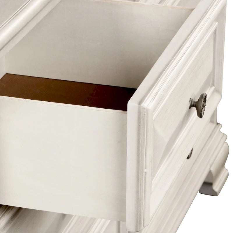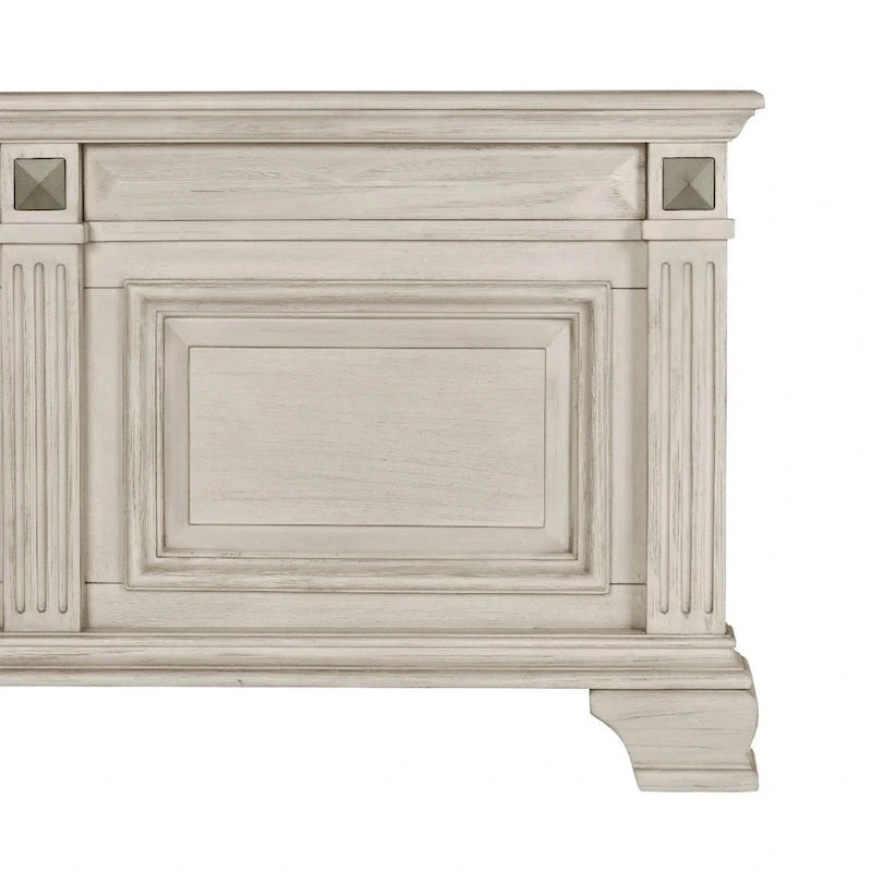 With an inviting display of order and opulence, the Renova Distressed Parchment Wood Bedroom Set brings a homey feeling to traditional stylings. The bed boasts muted silver accents, fancy fluted pilasters, and sturdy French bracket foot bases. The 2-drawer nightstand boasts adorable rosette knob hardware in a muted silver finish, English dovetail construction, and wide beveled drawer fronts.