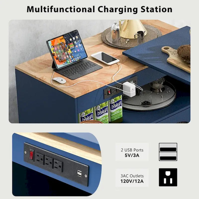 [Convenient Power Outlet] Designed with practicality in mind, our modern rolling kitchen island boasts the convenience of 2 USB ports and 2-hole sockets. Effortlessly charge your coffee maker, ice maker, and phones, while indulging in your favorite beverages. With a generous cord length of 2 meters, this kitchen accent cabinet can be utilized in various locations like the dining room and living room.