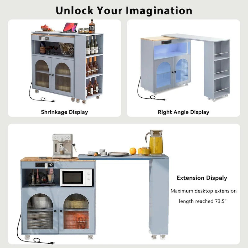 [Large Storage Space] This large cart can be used in combination with a tabletop or alone as a storage cabinet. The maximum desktop extension length reached 73.5 which is meticulously designed to optimize functionality and organization in your culinary space. This island offers an open storage shelf and a cabinet for all your essential items. Bid farewell to a cluttered countertop while also providing additional room for pots, pans, utensils, small appliances necessities.