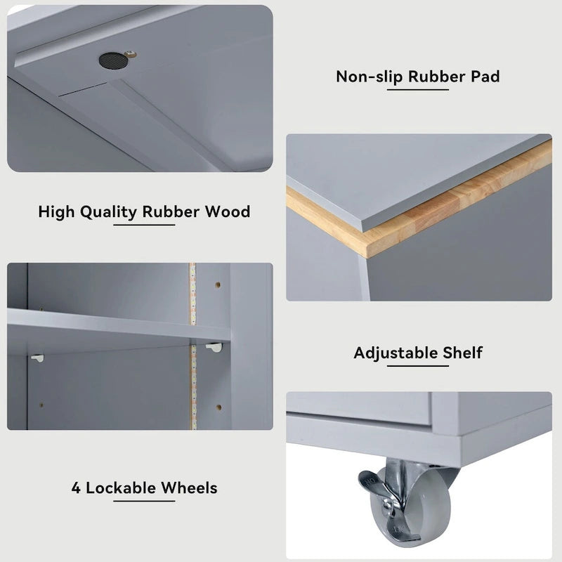 [Superior Quality] Crafted from high-quality MDF and smooth rubber wood, this kitchen island with storage offers exceptional stability and durability, ensuring long-lasting performance. The rubber wood tabletop is resistant to stains and water, providing added convenience for easy maintenance and effortlessly accommodating your small kitchen appliances while being easily cleaned.