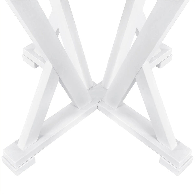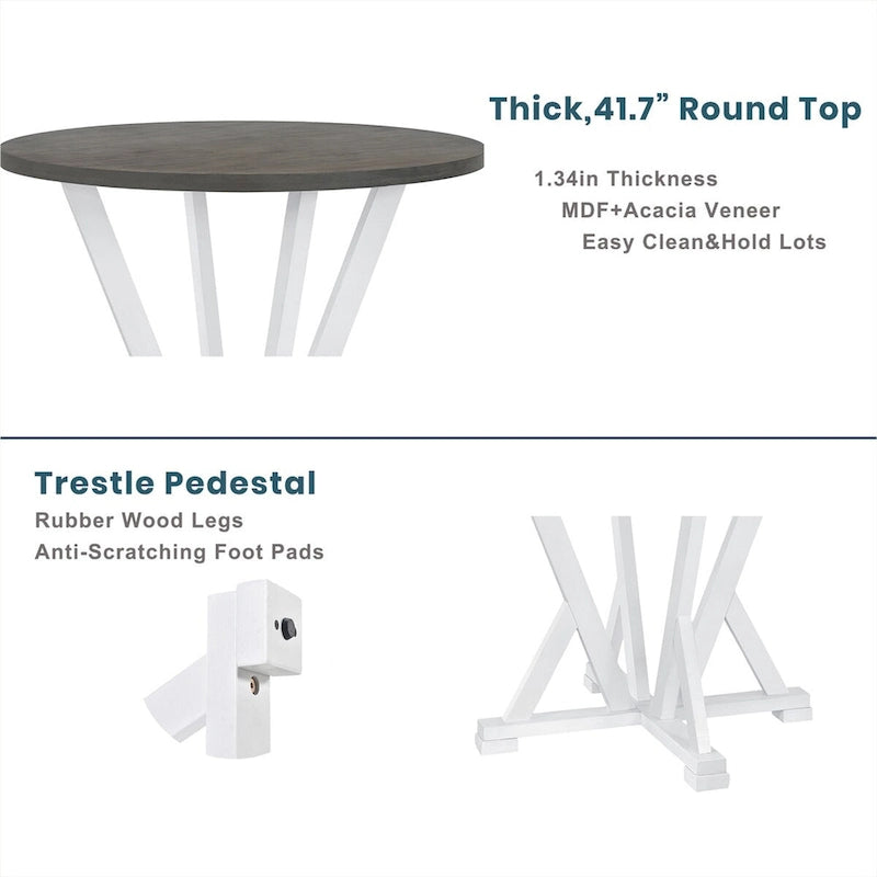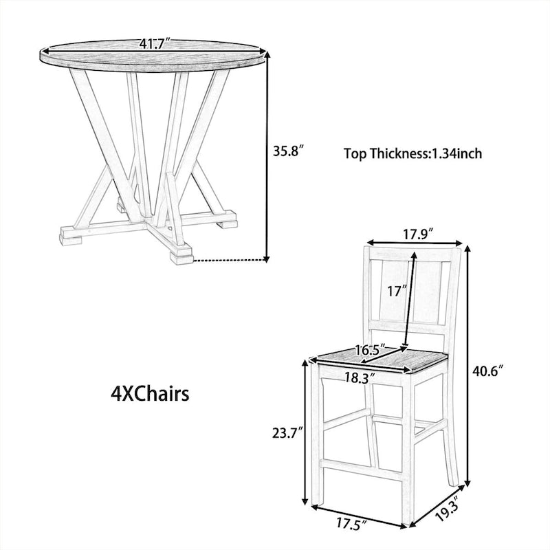Rustic Farmhouse 5-Piece Counter Height Dining Table Set, Round Kitchen set with 4 Dining Chairs and Thick Tabletop Selling Points:Counter Height // Round Table // Triangular Support // Trestle Pedestal // Thick Top // Anti-Scratching&Adjustable Foot Pads // Slatted Dining Back // Rubberwood Legs // Footrests // Set of 4 Chairs // 2 Colors AvailableIt will be not practical if a big dining set in small places. Designed with dia 41.7inch and round tabletop, this 5-piece dining table set will be well suitable for a small kitchen. Counter height dining chair with footrest provides extra comfort for daily informal family gatherings. Rubberwood legs and triangular supports under tabletop will keep the set longevity.Bullet PointsCounter Height Dining Set for 4Featuring an understated silhouette with clean lines, this round dining table set brings elegant farmhouse flair to your home. Come with 4 counter height chairs and 1 counter height table, this kitchen set provide enough space for the whole family to enjoy a quality dining time.Solid Wood MaterialDurability and stability are characteristics of this dining set. The whole legs are all made of solid rubberwood which make them(table and each chair) hold 250lbs weight capacity. Slatted-Back Dining ChairsThis dining chair is made of a solid rubber wood frame and full back with a slatted openwork design. Designed to suit different styles from farmhouse to modern, the chair will work well in any kitchen island or counter height table.Assembly&CareSimple assembly required. All hardware and instructions are included in the boxes with all marked parts for easily assembling. With its refined coating, mild detergent on a soft non-abrasive cloth will make the table set clean.Dimensions and WarrantyDining table: dia41.7x35.8inch(diaXH);Dining chair: 17.5x19.3x40.6inch(LXWXH), Seat depth:16.5inch; Seat to ground: 23.7inch. 2 boxes in total which may not come together.Weight & Dimensions[Overall Product Dimension]Dining Table: dia41.7x35.8inch(LXWXH);Top Thickness:1.34inchDining Chair:17.5x19.3x40.6inch(LXWXH);Seat Depth:16.5inch;Seat to Floor:23.7inchOverall Product Weight:Table Net Weight: 57bs;Each Chair Net weight:15lbsWeight Capacity:Table weight capacity:250lbs;Per Chair weight capacity: 250LbsSpecificationsProduct Type: 5-Piece Round Dining SetColor:White Frame+Grey Top/White Frame+Brown TopMaterial:Tabletop:Table/Chair Legs: rubber wood;Tabletop: MDF+Acacia Veneer;Chair Seat Frame: MDF+Acacia VeneerAssembly Required:Yes(All Tools Included)Notes1.Manual measurement has been used, there may be some reasonable errort, thanks for your understanding.2.Due to factors such as display equipment and shooting environment, the color of the item may be slightly different from the picture, which is a normal phenomenon, please refer to the actual item3.Improper use of screws may cause the product surface damage! Please be careful when installing.4.It is recommended to put a layer of foam or soft cushion on the floor when installing to avoid scratching the floor.5.If the item has any defects, damage or missing parts, please contact us with pictures or videos so that we can understand your needs and help you quickly, and always remember to retain its original packaging to ensure any return requests. We will try our best to solve any problems you may have.6.If you receive the wrong product, please attach the product picture, the infographic of the outer package and the picture containing SKUs, so that we can verify and quickly deal with it for you