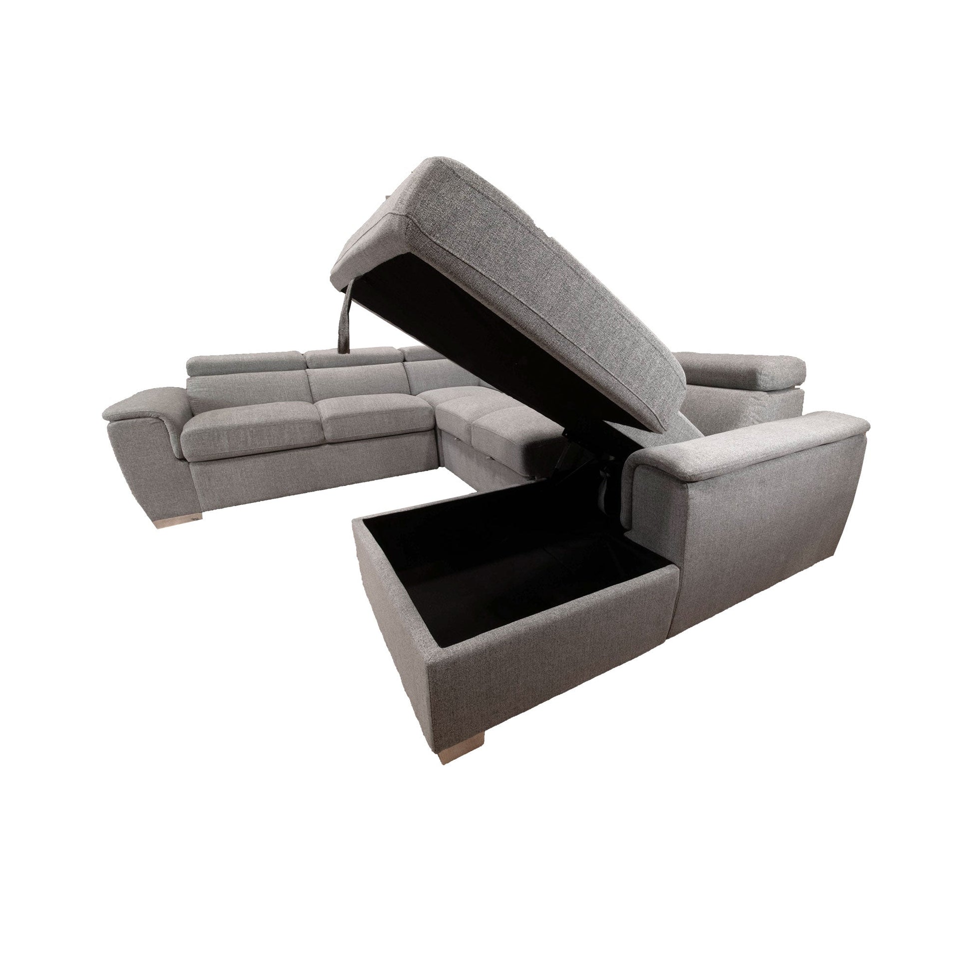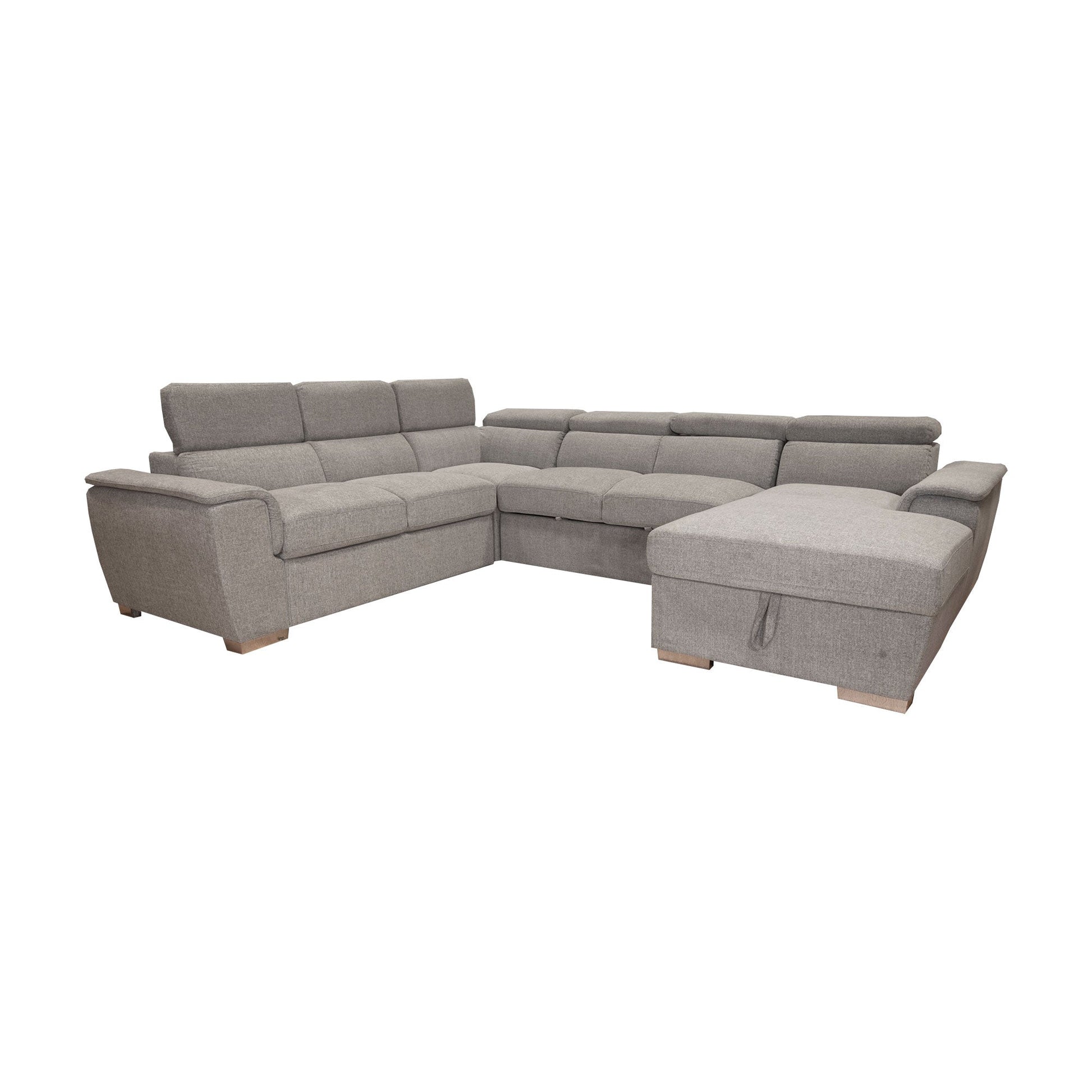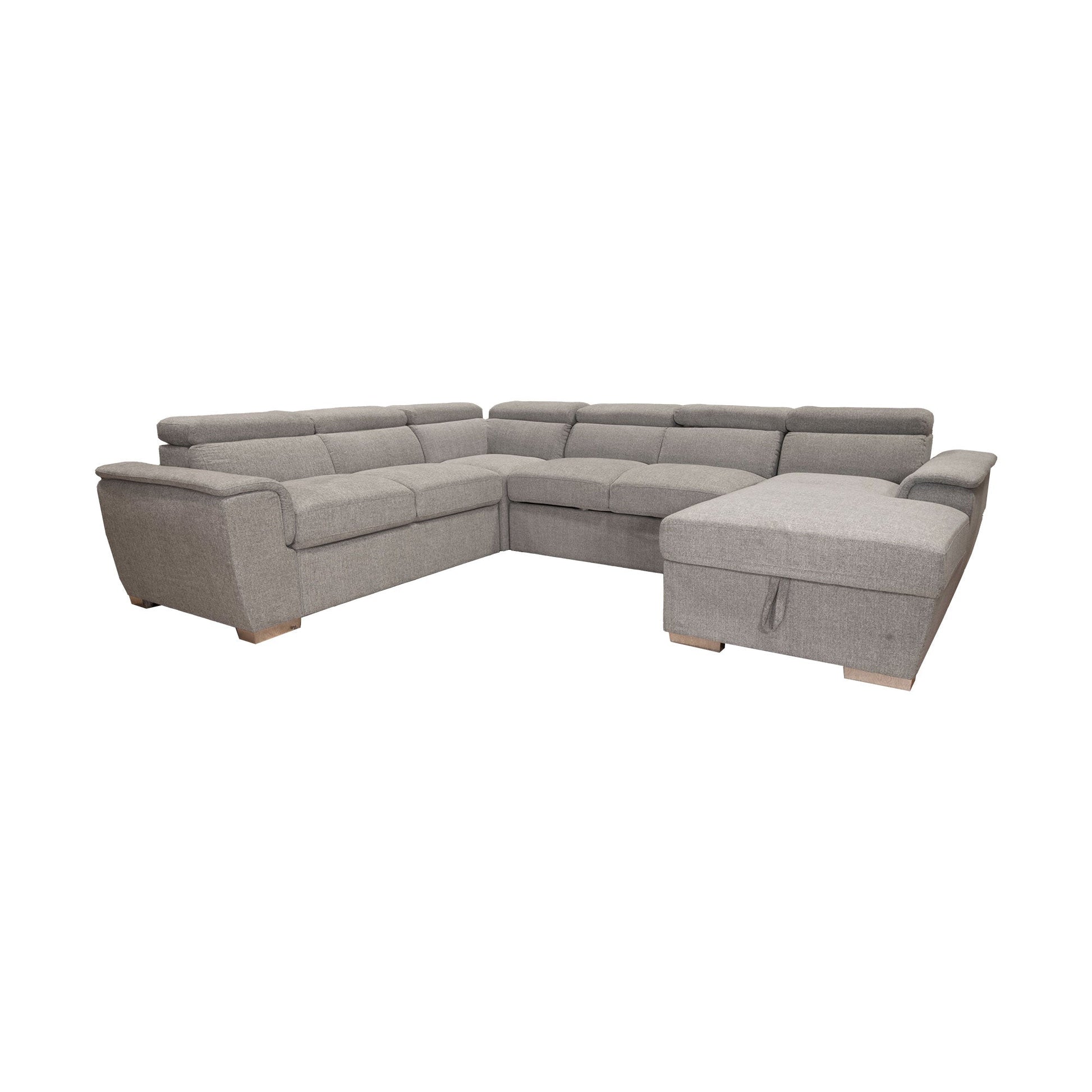 The Wyatt Sectional is shown in Thora Stone Fabric. Available with a unique pullout sleeper and storage chaise. Tons of functionality for all occasions!